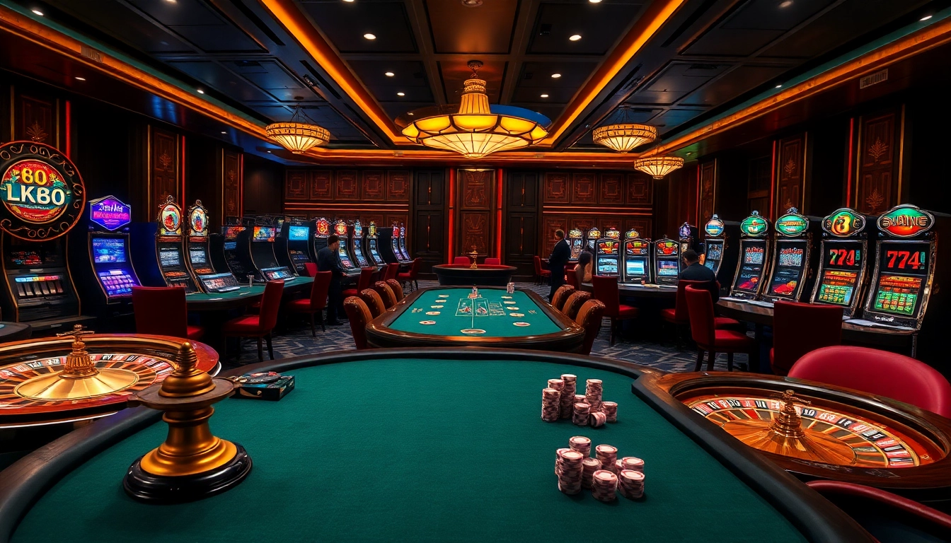 Players enjoy high-stakes games at a luxurious tk88 casino table, featuring vibrant slot machines and roulette wheels.