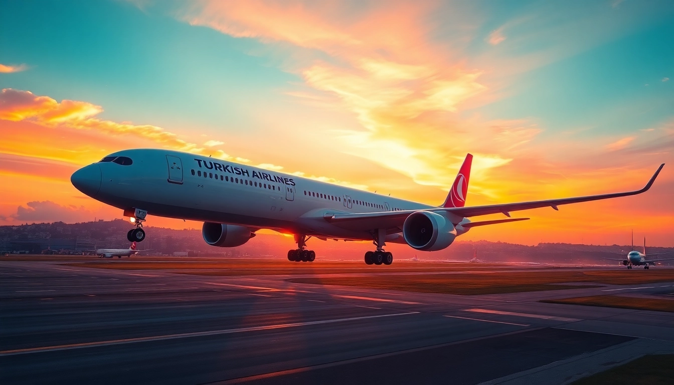 Turkish Airlines flight TK88 taking off from Istanbul Airport at sunset, exuding travel excitement.