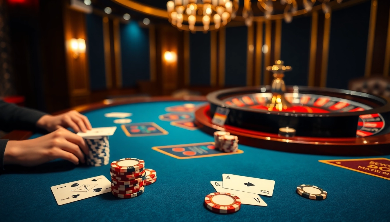Experience high-stakes poker with BDTK1 chips and cards in a vibrant casino setting.