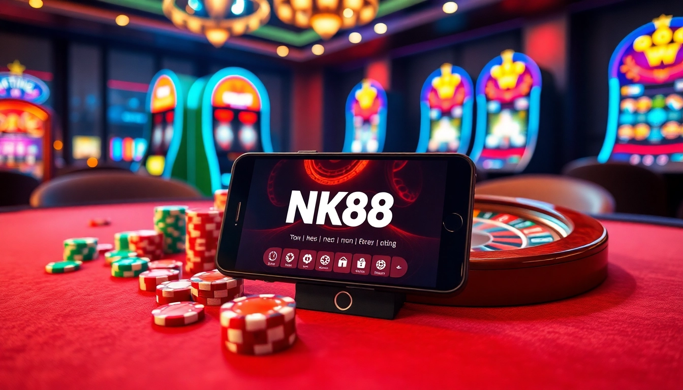 NK88 app displayed on a smartphone amidst a luxurious casino setting with poker chips and roulette wheel.