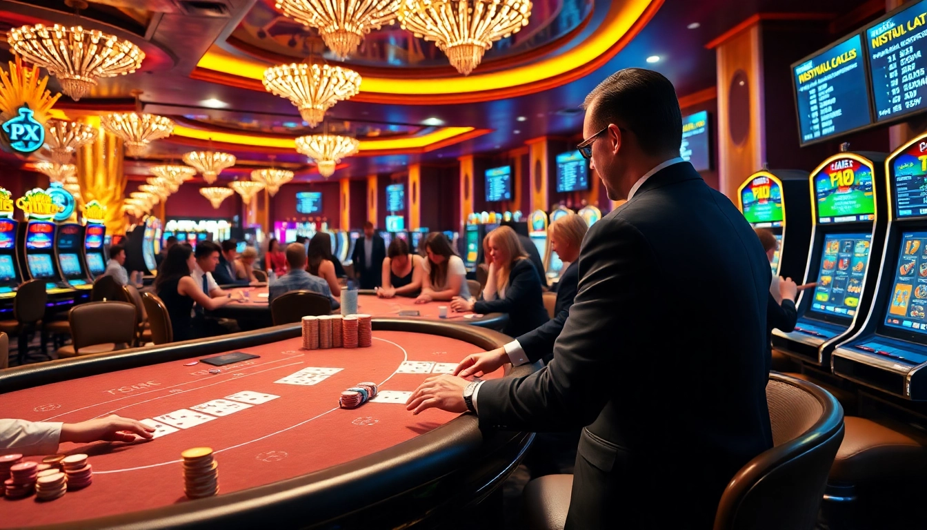 Players enjoying various casino games, including poker and slots, highlighting PXJ atmosphere.