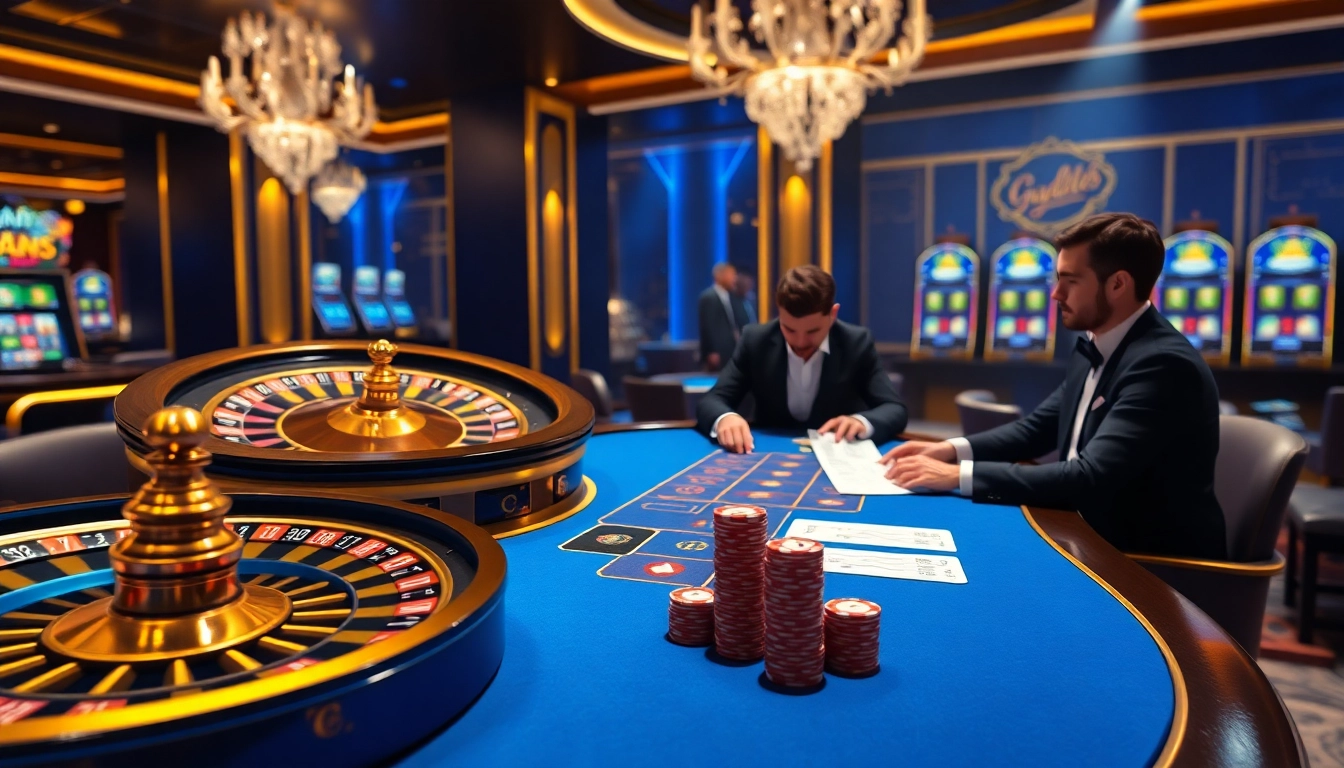 Players engaging at Goal123 casino tables with vibrant colors and high-stakes ambiance.