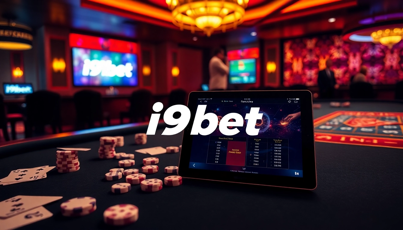 Gambling excitement with i9bet's vibrant casino scene featuring tables and cards.