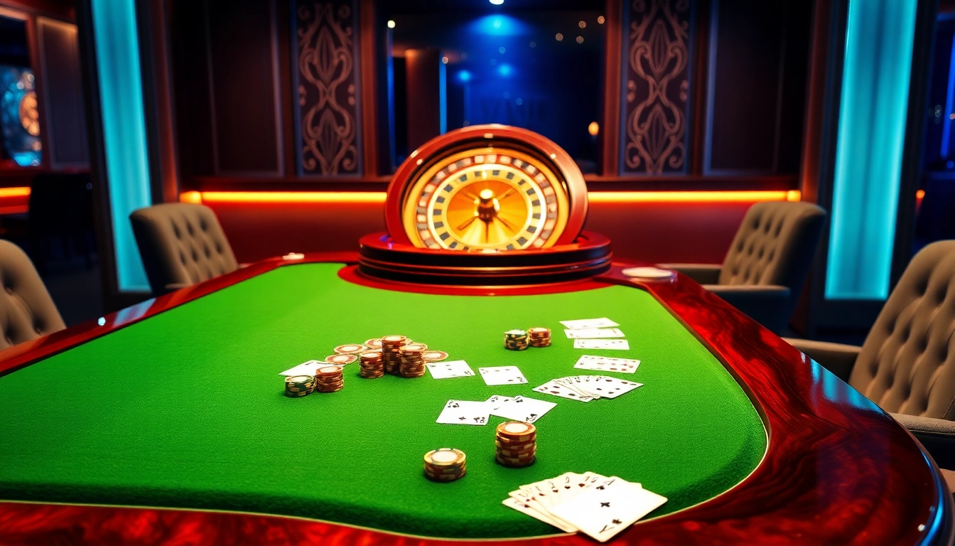 Experience luxury at Sun win casino with a vibrant gaming table, poker chips, and an exciting roulette wheel.