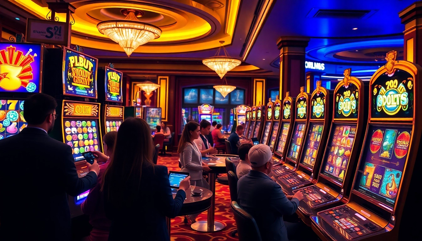 Pemain menikmati mesin slot yang menarik di lingkungan kasino yang semarak, menyoroti kegembiraan dan kemewahan.
