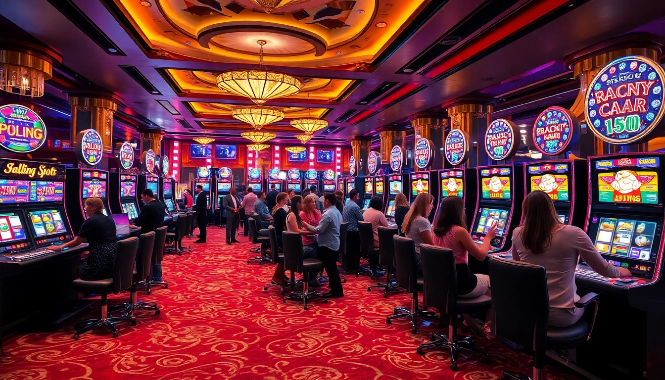 Pemain menikmati mesin slot yang cerah dengan gulungan berwarna-warni di suasana kasino yang mewah.