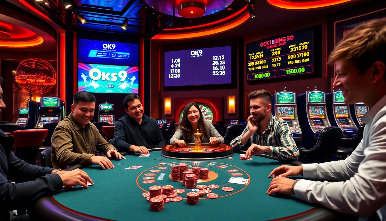 Engaging gamblers at a poker table, showcasing OK9 BÓNG ĐÁ excitement in a vibrant casino atmosphere.