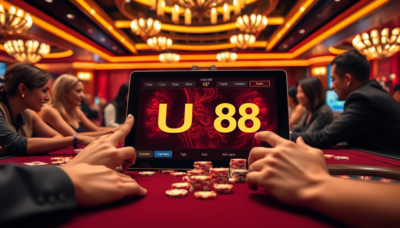 UU88 players enjoying a thrilling poker game with stylish chips and a vibrant atmosphere.