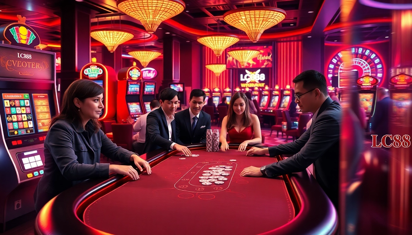 Players enjoying a thrilling poker game at LC88 casino with vibrant slot machines and a luxurious atmosphere.