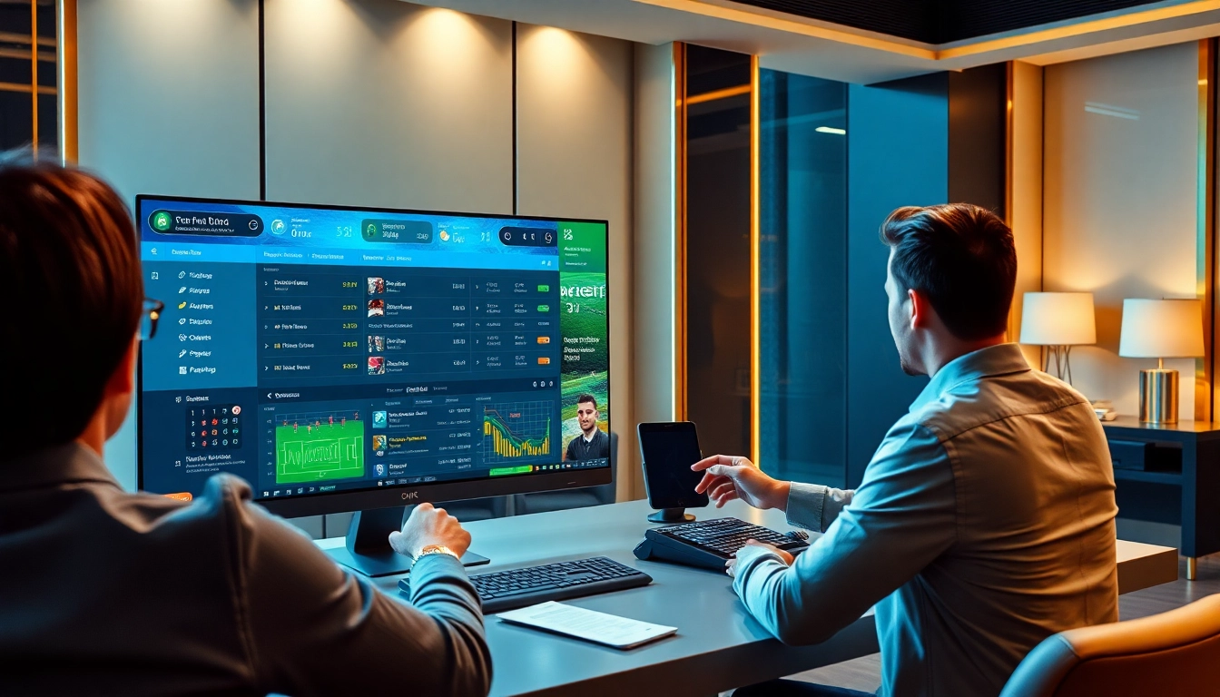 Engaged bettors enjoying แทงบอล on a high-tech online sports betting platform, showcasing live odds and vibrant betting slips.