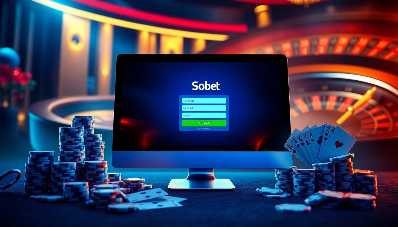 Engaging sbobet login indonesia interface amidst casino elements, showcasing online betting excitement.